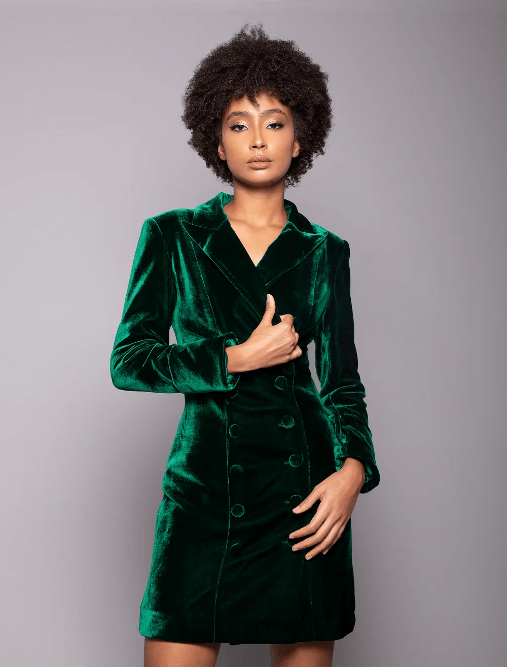 This suite Dress sustainably sourced mid-weight silk, this mini has a breasted blazer cut with strong padded shoulders.