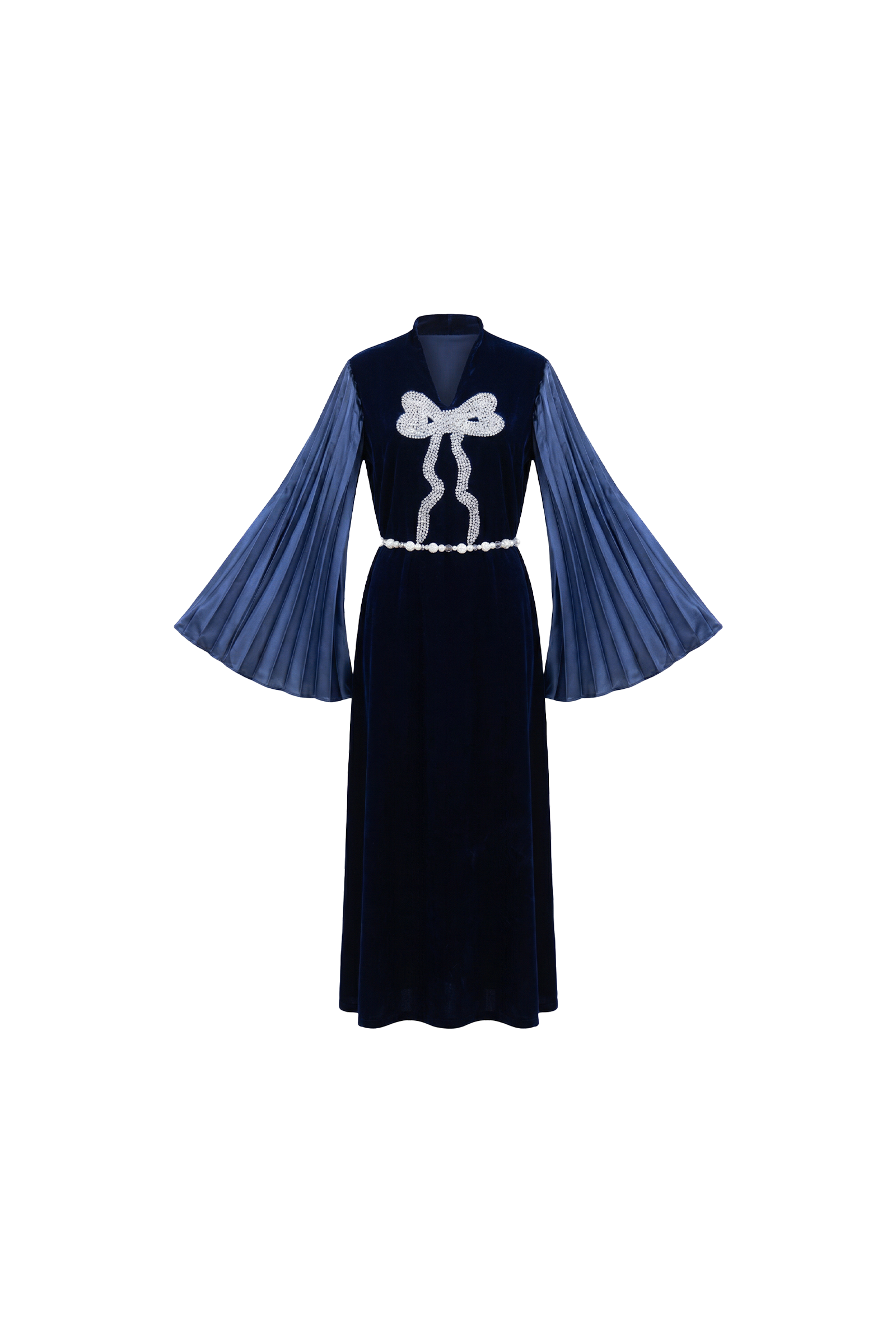 A refined velvet abaya designed with a sleek, elongated silhouette and dramatic razmir pleated sleeves that flow with every movement.