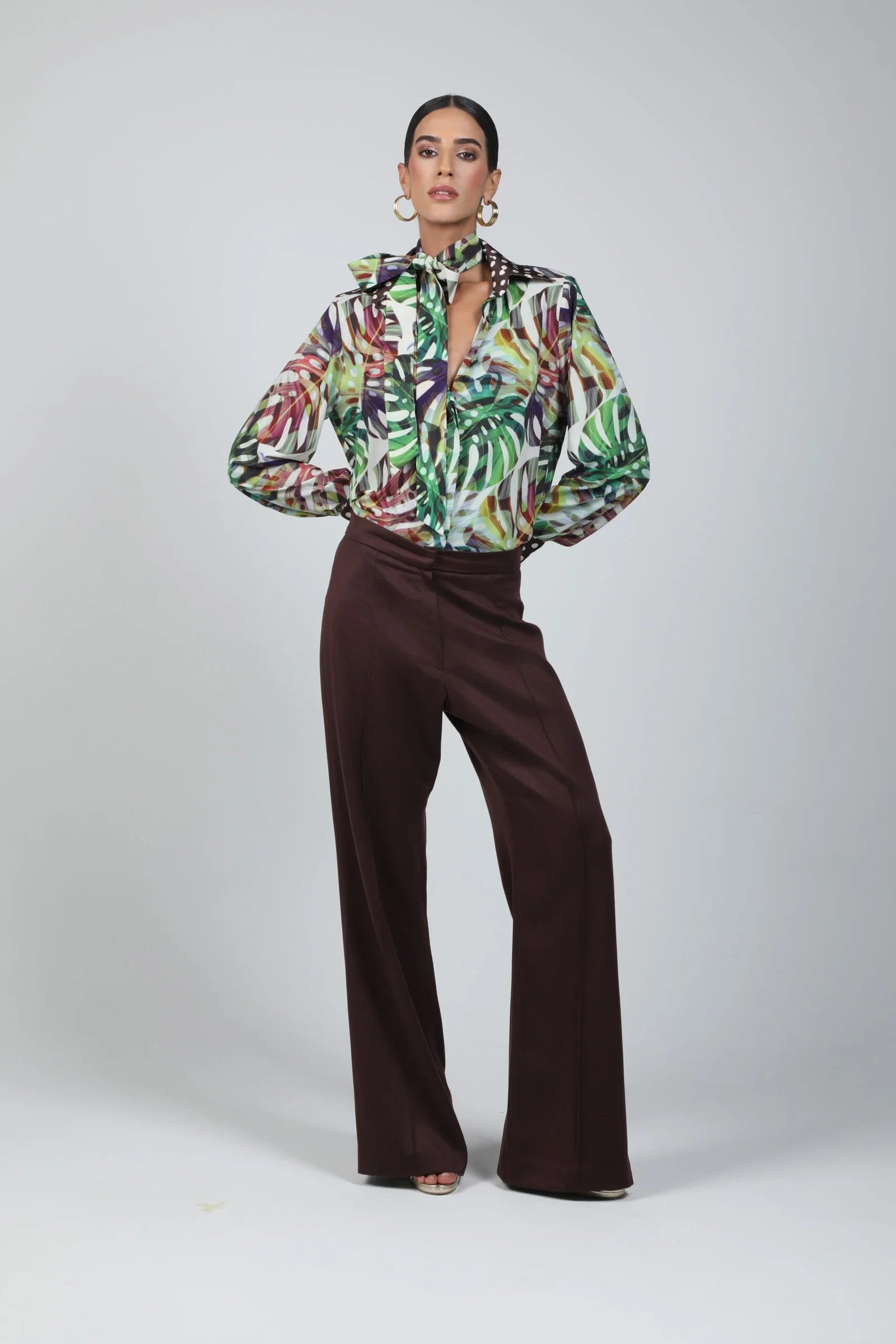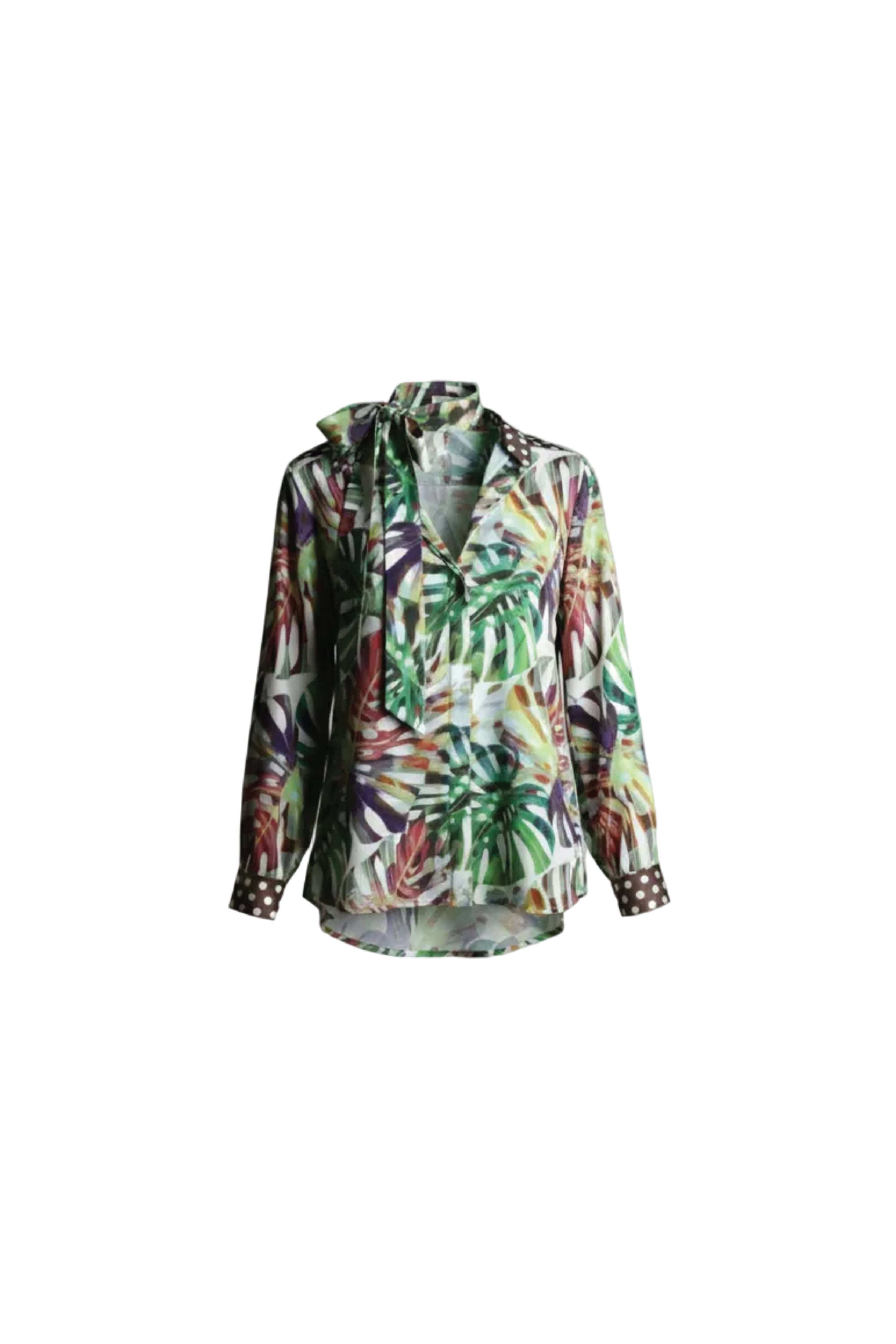 This shirt is a lightweight button-down featuring a vibrant tropical leaf print in layered shades of emerald, lime, burgundy, saffron, and violet. The design mixes a soft transparency with bold colors, giving it a fresh, modern elegance. It includes a polka-dot tie scarf, adding contrast and a playful, high-fashion touch. The cut is slightly relaxed with long sleeves and a refined collar, making it perfect for both statement daywear and polished evening styling.