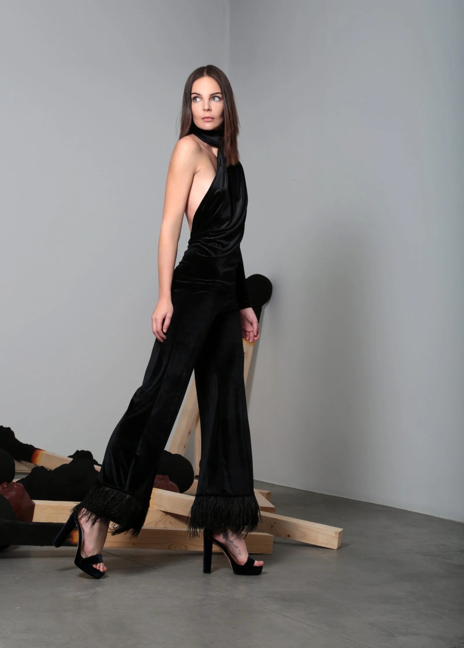 Silk velvet pants in royal blue or black, elegantly trimmed with feathers at the leg edges. Perfect for both casual outings and evening occasions, they add a touch of sophistication and versatility to any wardrobe, easily paired with different outfits for a chic and polished look.