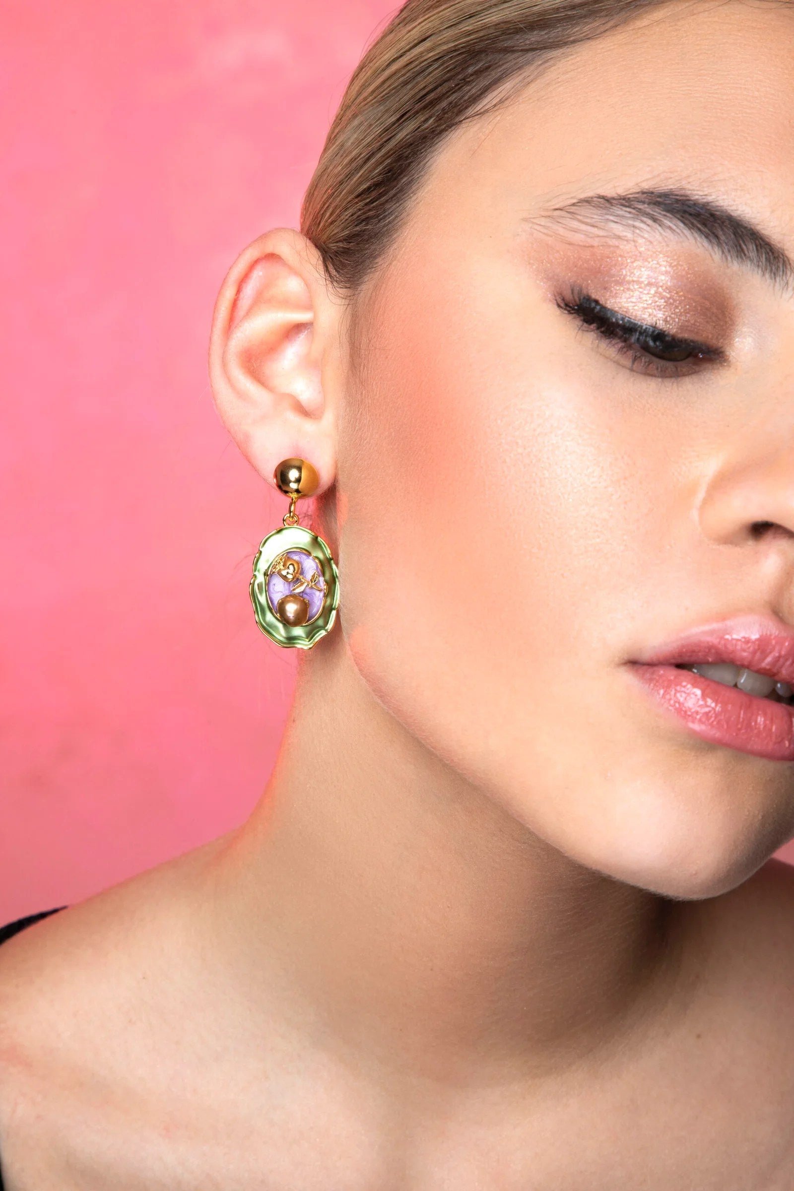 This earring showcases a hand-painted tulip on an oval medallion, framed with a soft green enamel border. The floral design is complemented by a glossy gold stud and a gold bead accent hanging below, giving the piece a romantic and artistic flair.